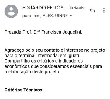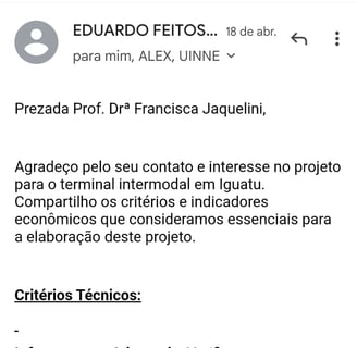 O Coordenador de Engenharia Operacional da TLSA, Eduardo Feitosa Cavalcante, enviou ao e-mail institucional da Profa. Dra. Francisca Jaquelini de Souza Viração os critérios e indicadores econômicos que a TLSA considera essenciais para a elaboração do projeto.